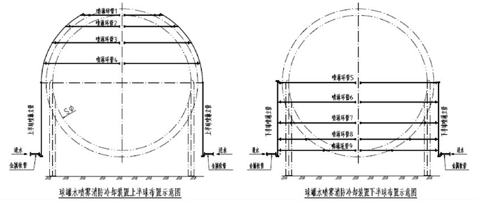 1、球罐水噴霧消防冷卻裝置選用ZSTW B型水霧噴頭(也可根據用戶要求選擇),噴頭工作壓力不低于0.35Mpa,噴頭噴口距罐壁不大于700mm;